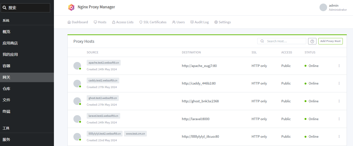1. 进入 Websoft9 控制台 网关 模块,依次打开菜单: > Hosts > Proxy Hosts
