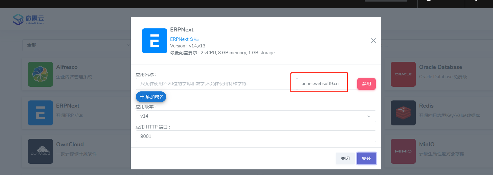 4. Websoft9 应用商店 任意一个应用,进入 安装 状态后,系统就会自动产生:应用名称.inner.websoft9.com 类似的子域名